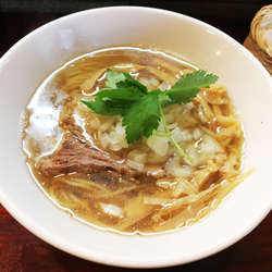 若き店主はこちらにいる。新店への思い入れもあるのだろう。関西では流行りの貝出汁ではあるが、札幌ではまだまだ少ない貝出汁を使った店。貝出汁醤油800円を注文。あさりを効かせた清湯スープで貝好きにはたまらない。あさりの酒蒸しをイメージしたかのようなアルコール分(飛ばしている)も感じられ、実に面白い。動物系や煮干しなども加えて、軽めながらも旨味はたっぷり。香味油も貝のようだ。