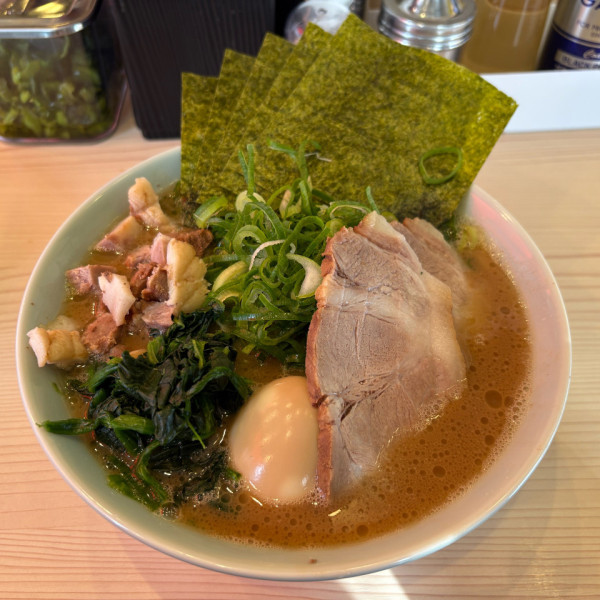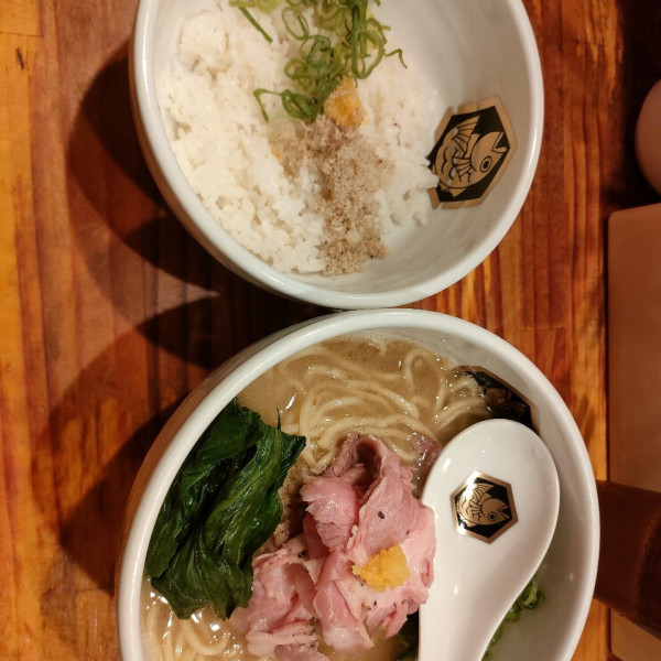 東京都墨田区江東橋3-8-7 錦糸町駅前プラザビル1Fマップで見る濃厚豚骨スープと醤油の効いたカエシはご飯によく合う!木曜から週末限定の燻製チャーシューは燻香とレアな感じでジューシーとここでしか食べられない。若干豚骨の癖を感じるので油(鶏油)多めが個人的にオススメ!今後、改良