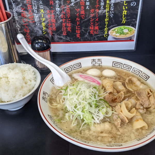 ラーメンショップの総本山といわれるお店。営業時間は早朝からお昼まで。あっさりめの豚骨正油に麺は細めのストレート麺。注文は店員さんに聞かれてから。