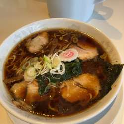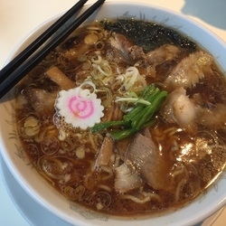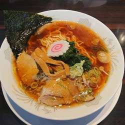生姜風味の醤油スープ。表面を覆う背脂。バラ海苔と玉葱の食感も良く直ぐに完食。店内広く家族向け。