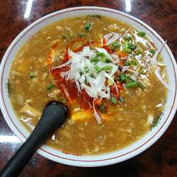 とろみの有るあん。豆腐やタケノコなど具材は多い。