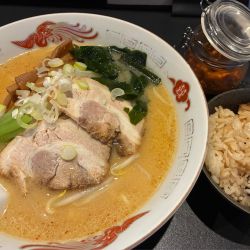 醤油・塩が細麺だった為太麺が食べたく味噌へ。でくの坊よくお世話になってたので懐かしく思いますね。味噌ラーメンに別添えで自家製のニンニク辛味噌がついてきます。スープはかなりあっさりシャバめなのでこれを入れるのが◯。珍しい中太ストレートはもっちり美味いがスープには絡まないかな。炊き込みご飯が美味すぎる笑