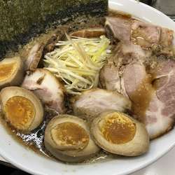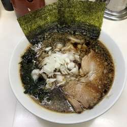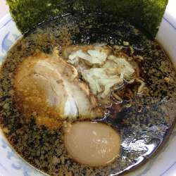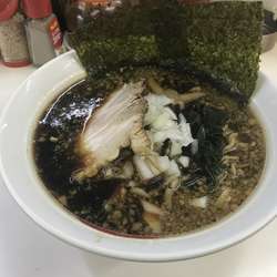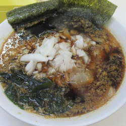 スープは、竹岡式らしくブラック。表層を、程々の量の細かい背脂が浮遊。