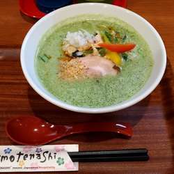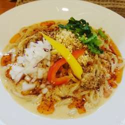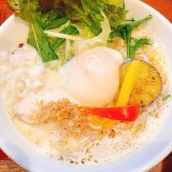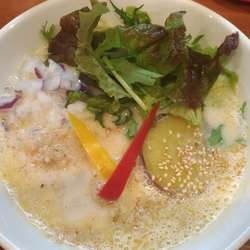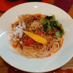 18/8/27訪問。過去分ですが、提供終了しているので、足跡を残させていただきます。担々めん(900円)を。スープは、適度な辛さで、まろやかな口当たり。薬味類の使い方が上手。麺は、しっかりと茹でられた細麺。全粒粉使用かな、やや茶色っぽい麺だ。具は、パプリカ・挽肉・赤玉ねぎ・ナッツ・白ごま。なかなか面白い担々麺でした。