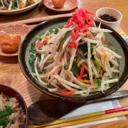 着丼まで10分。野菜もりもりで、香ばしい香りが。ややしょっぱいかなーと思いましたが、シャキシャキ野菜たっぷりでお腹いっぱい。ランチ定食なので、小鉢もあって大満足でした。ご馳走様でした。