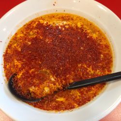鶏ガラスープの中で溶き卵とひき肉と粒ニラが唐辛子的な赤味と混じり合って、