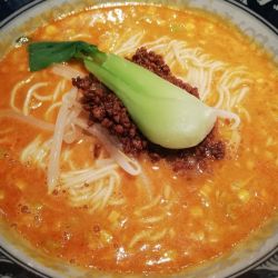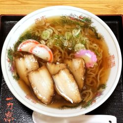 まずはスープ。脂が少なく、豚骨と魚介のすっきりとした味。麺はモチモチ、メンマとチャーシューがトッピングされている。付属のスプーンは先がフォークになっていて面白い。