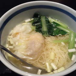麺は硬めに茹で上げられた細麺で程良い歯切れが心地良い、ワンタンはプリプリとした大ぶりな海老が詰まった大きなものが2個で満足出来る内容。