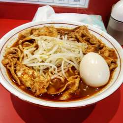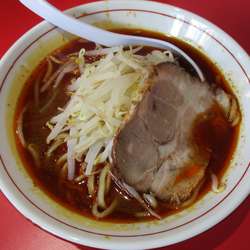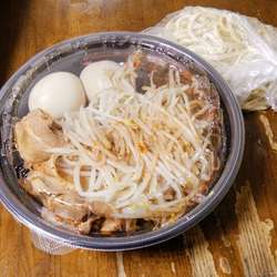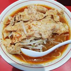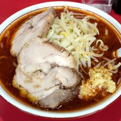 提供直前にニンニク入れるか聞かれます。もちろんなしで。スープの色、これは舌や毛穴にくるやつだなぁと思いましたが一口。なかなか尖った辛味がありジワジワきます。二口目。うんかなり辛い。麺は中太でなかなか食べ応えありスープに合ってます。もやしがいい仕事しますが後半辛スープに浸かり箸休めにもなりませんがありがたい存在。チャーシューは厚めの濃い味二郎系。辛いもの好きには癖になるのでしょう... 続きを見る