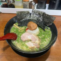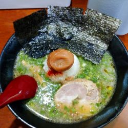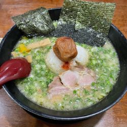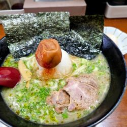 上品な豚骨スープと歯応えしっかりの自家製麺、そして見た目通りのインパクトある一杯。豚骨はくどさが全くなく、旨みだけが上手に抽出されています。口に含むと鶏かと思うほど上品。このままのスープの方が私は好きなので、みぞれは散りばめずにレンゲで掬ってお口直し的な存在としていただきました。梅干しも同じく。めちゃ美味しかったです^_^