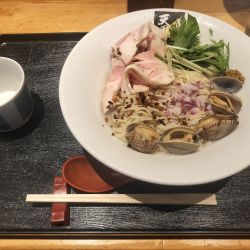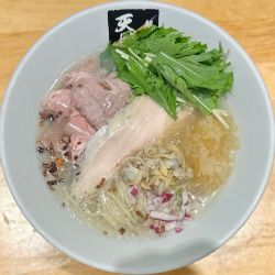 天国屋らしい上品な浅利出汁の浸し麺。トッピングの浅利が美味しい。出汁をとった浅利じゃなくて、トッピング用に火を入れたのだろう。しっとりしたチャーシューは、冷やしでも固くならなくて良い