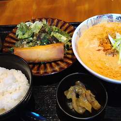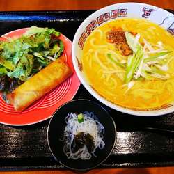 セットの内容は、担々麺、春巻き&サラダ、春雨の酢の物、ライス。担々麺の丼は割と小さめ。