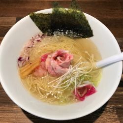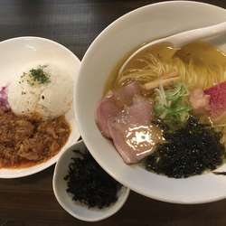 少し前から気になる店舗だったので初訪。ミニカレーとセットのこちらをポチり。塩✖️魚介のスープはめちゃ旨。麺もさることながらカブの薄切りが入っていたりとオシャレな一杯。レアチャー、三角にカットした海苔も抜群。セットのカレーも肉がホロホロ、辛味も良い。カレーだけでも満足。大変美味しくいただきました。ごちそうさまでした。