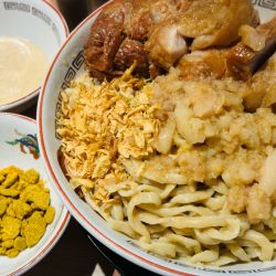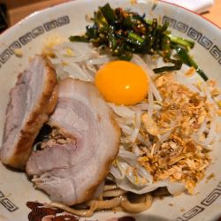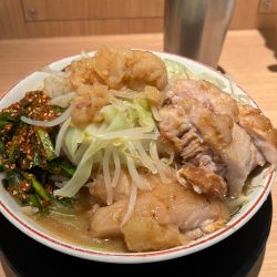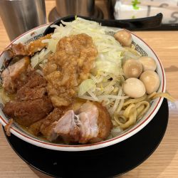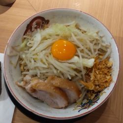 会社を早退して、眼科→皮膚科→内科と医者3件まわって、お昼いまいち食いそびれた感があるので、早めに八重洲の豚山へ。いつも通り、汁なし(ニンニク)+辛ニラをオーダー。頼んでないのに野菜が結構な盛り。うーん、やっぱり無難にうまいね。野菜のおかげで少し薄く感じたけど、辛ニラ混ぜたらカオス。