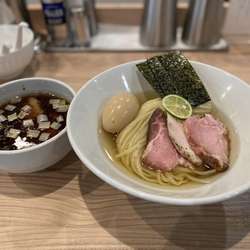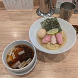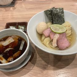 続いてこちら~鶏らぁめんより2分ほど遅れて着ら~注文時につけめんは10分ほど時間を要す説明あり。麺は太平打ちストレート加水高め。茹で加減ヤワメで小麦が芳醇。なめらかで伸びがありのど越しもよい。昆布水は適度な冷え具合でトゥルンとした粘度。香り高く旨味もGOOD。麺に纏わり小麦とのハーモニーがタマラナイ。つけ汁は熱めなシャバ系塩。クリアなスープは鶏、魚介などの旨味が効いている。塩ダ... 続きを見る