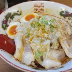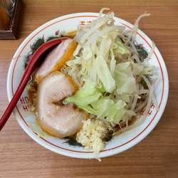 大豚ラーメン(830円)を、カラメニンニク・麺固めで。スープは、驚く程に澄み切った清湯。出汁感はかなり希薄で、醤油感で食わす印象。麺は、屈強な太麺。固めコールはやりすぎでなく、食べやすい。二郎インスパイアで例えるなら、【大】で使用している麺に近い印象。野菜は、適度なキャベツ率で、シャキシャキ。豚は、薄めのバラロールが2枚。商品名は「大豚」だが、これがデフォルトの商品。ちなみに先... 続きを見る