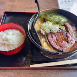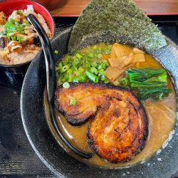チョイスはこの店の看板、和風豚骨の醤油965円。この日は平日でしたが盆休み期間中のためセットメニューは少なく、半チャーハン425円を単品注文します。