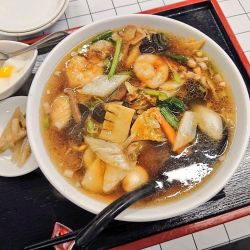 具は、五目あん(海老、白菜、キクラゲ、人参、筍、青菜、豚肉、イカ、うずら、ネギ、など。