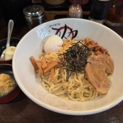立ち寄りで入った油そば専門店です。券売機でとりあえず定番っぽいものを選んで、生姜とマヨトッピングを追加してみました。店内は満席で外国のお客さんと地元の人っぽい人が半分くらいずついました。