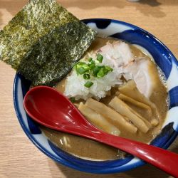 普通で200g、大300g、特で400gみたいです。ワンオペで非常に手際よくスムーズ。麺が特徴ある中太平打ち。食感とスープとの絡み具合は良好。スープ良い意味でバランス型。チャーシューがいただけないですね。