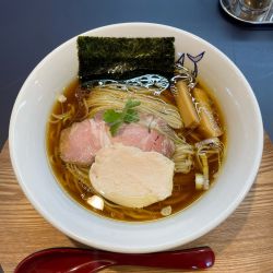 バリ鰹もあったが醤油清湯のつもりでらーめんを選択 ホール女史に勧められた鶏モモ吊るし焼き(500円)もポチる