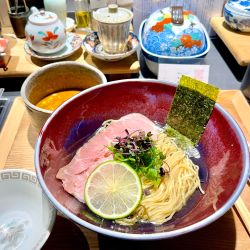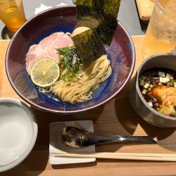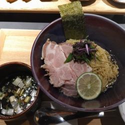 | メニュー | メニューの写真を見る 【梅】昆布水つけ麺(チャーシュー、九条ネギ、海苔) 1380円 |