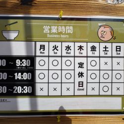 | 営業時間 | (月~水、金) 7:00~9:30/11:00~14:00 (土) 11:00~14:00/17:30~20:30 (日) 11:00~14:00 |