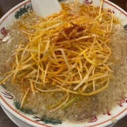 飲み後に物足りなさを訴える同僚にラーメン屋のチョイスをせがまれ、広い店内でお気に入りのこちらへ。
