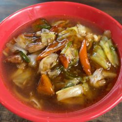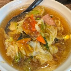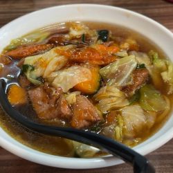 甘辛いスープにたっぷり野菜&レバーが美味しいです。ちょっと麺固めだったけど食べていくうちに柔くなってきました。