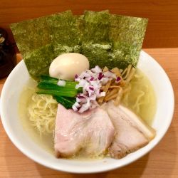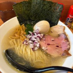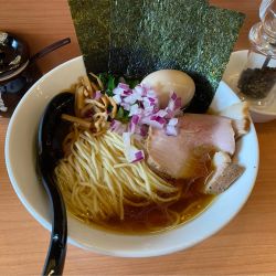 42分に着丼しました。トッピングは、海苔3枚、味玉、刻み紫玉ねぎ、細メンマ、小松菜、チャーシューでした。