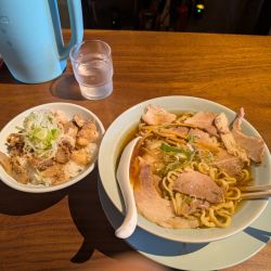 外国人旅行者、ドラマの聖地巡礼?近隣のコインP2箇所が満車で諦めようかと思いましたが一回りしたら空きが有り凸撃です…昭和レトロな路地を進む、此処で良いのか??と思ったら店がありました。思ったよりオイリーで出汁を感じられる醤油スープに菅野製麺の多加水麺、茹で具合も良くスープを纏います。チャーシューも柔らかく味がシッカリと…肉飯のタレは甘めでタップりでした。