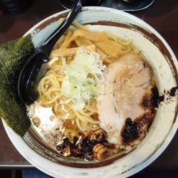 本日2軒目のため、軽めでクセのなさそうな掲題を選択。カウンターに着席です。店員さんの調理を眺めつつ10分ほどで着丼。ビジュアルはいわゆるねぎらーめん。しかし、何やら香ばしい香り。