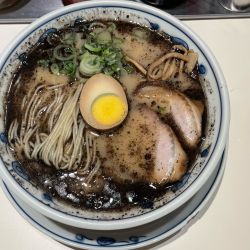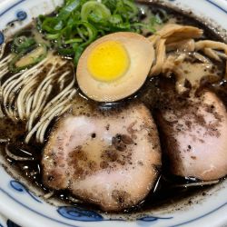 見た目は漆黒。表層にたっぷりの馬油。香りも良いですね。豚骨臭にニンニクが合わさりジャンク。