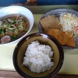 | メニュー | メニューの写真を見る 看板にとんかつ、和風らあめんと書いてあるお店。 |