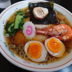 厄除けのお麩に、海老、大判チャーシューに、ほうれん草、煮卵玉子。