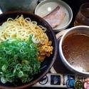 つけ麺味噌。ピリ辛のつけダレに、麺は中細。青ネギは最初から盛られてますが、卓上に青ネギのタッパがあって入れ放題なので、ちょっと乾いてますけどでもコスパは良いです。高菜も卓上にあります。