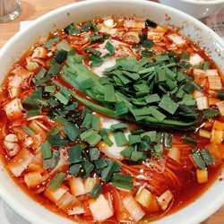 旨味をしっかり感じさせつつの、絶妙なすっぱ辛いバランスのとれたスープ。青菜に、これまたスープに合うニラとネギが盛り沢山なのが嬉しい。硫化アリルが食欲をそそります。健康的で胃に滋養。