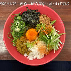 まぜそば。中太麺、カレーのスパイスがよく合う、ボリューム満点、卵がちょうどよくまろやかに、また食べたくなる。