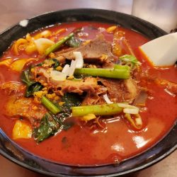 【注文】牛杂刀削面(税別850円)。「牛杂」は牛の複数の様々な部位を示す語だろう。日本語メニュー名は「牛すね、モツ入り刀削麺」だ。メニューを見ると激辛刀削麺(... 続きを見る