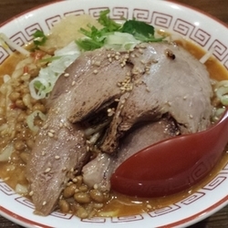 7/30で閉店しちまったアキラ。通常営業ラストナイトにフィナーレを飾りに。大常連の麺友さん、何度も通ったであろうカワタカOBと、店主さん馴染みの顔が揃う賑やかで楽しい空間。トロトロチャーシューやしっとり鴨肉などを頂いた後に出てきたのは大振りな丼にこんもり麺が載っかるつけ麺がドーンと。つけ汁にはアキラの代名詞と言っても良い納豆がイン。2... 続きを見る