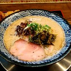 さておき表題をオーダー、暫しで着丼。どんぶりの形状やトッピング(キクラゲや高菜)などビジュアル的には博多豚骨がベースのようです。