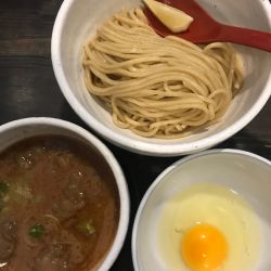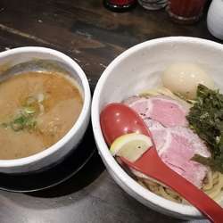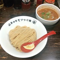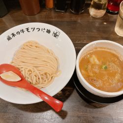 創業以来ファンを虜(とりこ)にする“牛モツつけ麺”──濃厚魚介とんこつに極太ちぢれ麺、プリッとモツの三重奏で知られる一杯である。