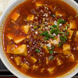 大陸中華系ゆえ配膳は爆速。そしてこの豆腐の量。辛味は辣油と唐辛子、痺れは華やかに香る花椒。一応片栗粉の餡掛け仕様ながら、ホールスパイスと豚挽肉を使った香味オイルの存在感も秀抜、青白二種の葱が清涼感を演出する。