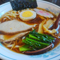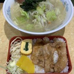 らーめん定食(お弁当付き)1000円。お馴染みの白河らーめん他店と違う所、スープは比較的まろやか、ぬるめ、モモチャーシューやや味劣る、玉子1/2付きだけど普通のゆで玉子、麺は柔め。ビックリしたのはお弁当付き。写真の通り中々良いパフォーマンス。