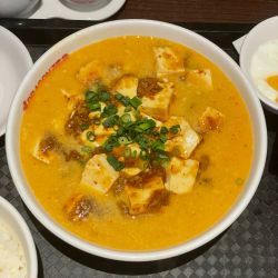 スープは、担担麺主体。そこに麻婆豆腐オンのような構成。辛味はなかなかマイルドなので、卓上のアイテムでカスタム。