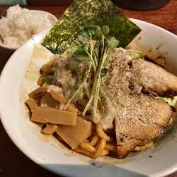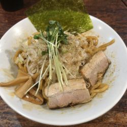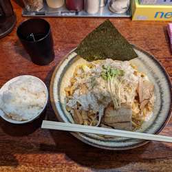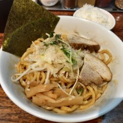 極太麺の油そばの濃厚(濃厚=背脂マシの雪化粧)はランチ無料ライスとも非常にあう!😋