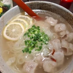 透明なスープに、大量のモツが浮いていました。スライスレモンが見た目の清涼感を増しています。