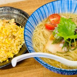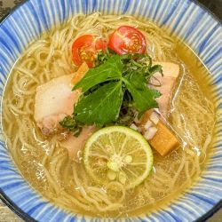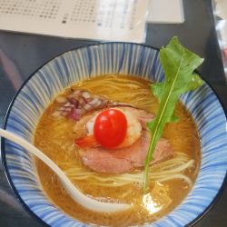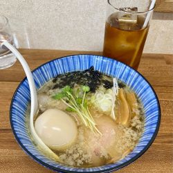 ガラベースが主体で魚介が低調なタイミング、油脂膜が多めのパンチあるスープ構成。