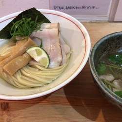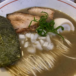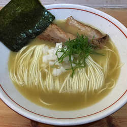 昆布水はとろみは平均的だが昆布が強め。麺は中太麺でコシが強く、藻塩とよく合う。スープのチャーシューは薄切りで焦げ目が付いていてうまい。特徴的なのはスープの三つ葉苦味がアクセントになっている。昆布汁をスープ割に使い完飲。