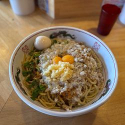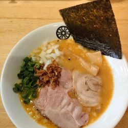 にんにくなしなので味噌󠄀味がきいて麺も極太モチモチで歯ごたえもしっかりあって美味しかったです。